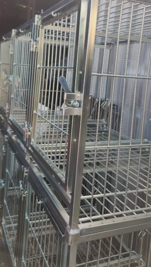 Conjunto com 3 módulos sendo: 1 módulo triplo, 1 módulo duplo pequeno e 1 módulo grande duplo. Fabricado em ferro zincado, com capacidade para 7 lugares. Contém bandejas, divisórias, pisos aramados removíveis e rodízios giratórios.